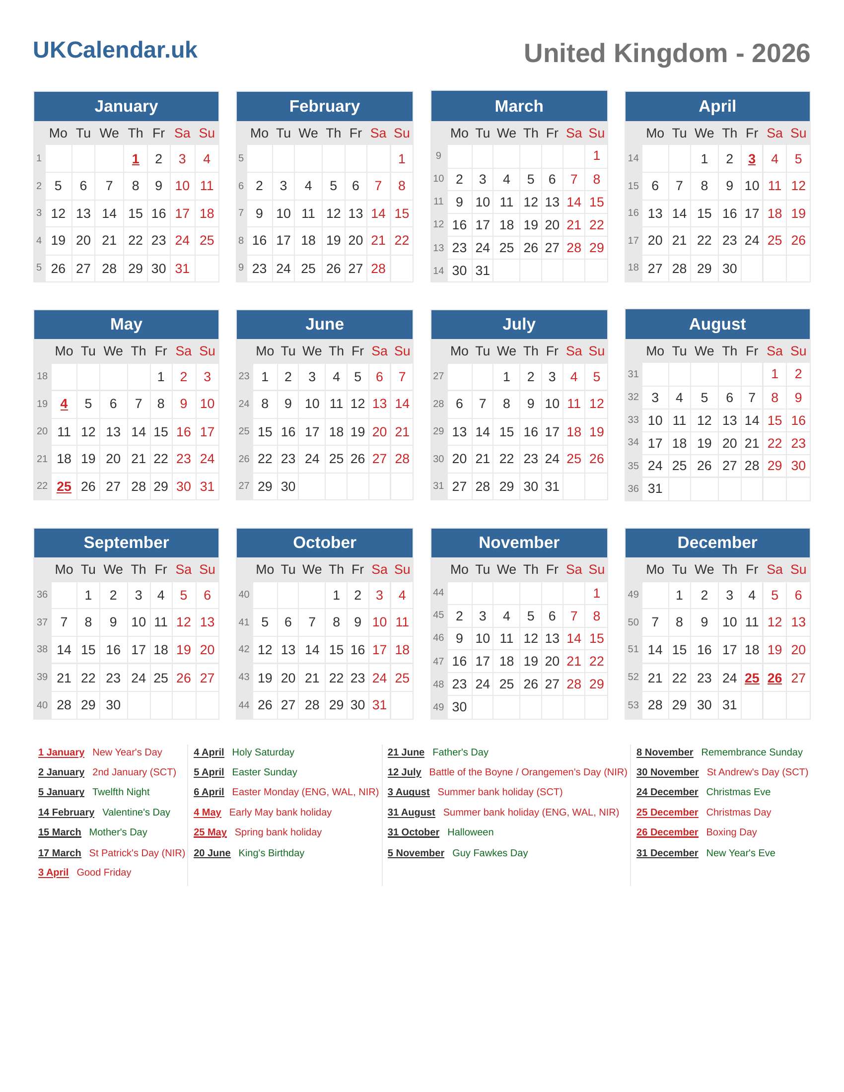 UKCalendar is an online calendar for the United Kingdom with the information of bank holidays, school holidays, and observances.