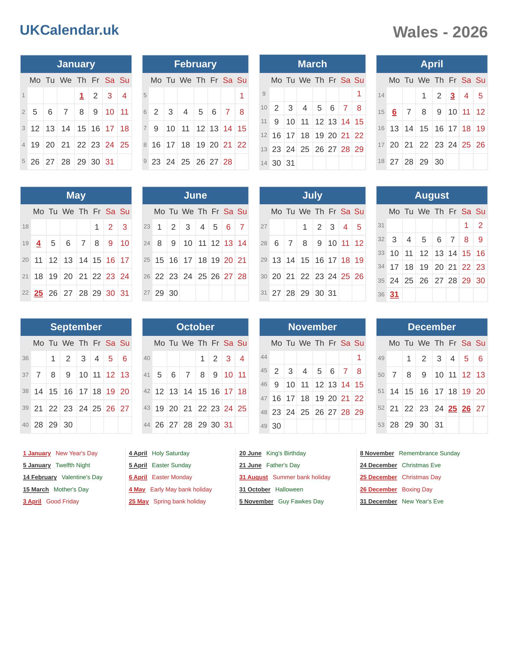 Calendar 2026 - Wales