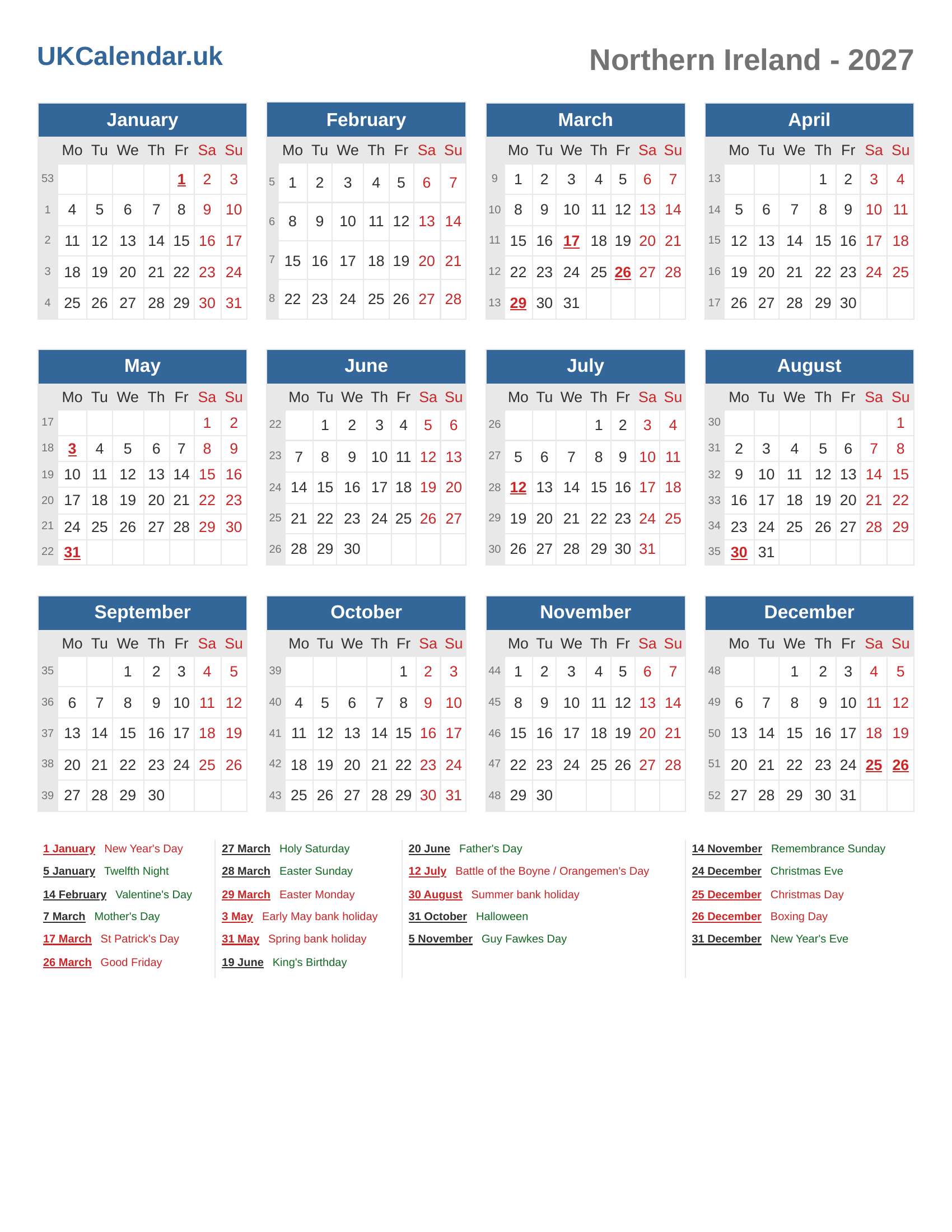Calendar 2027 - Northern Ireland