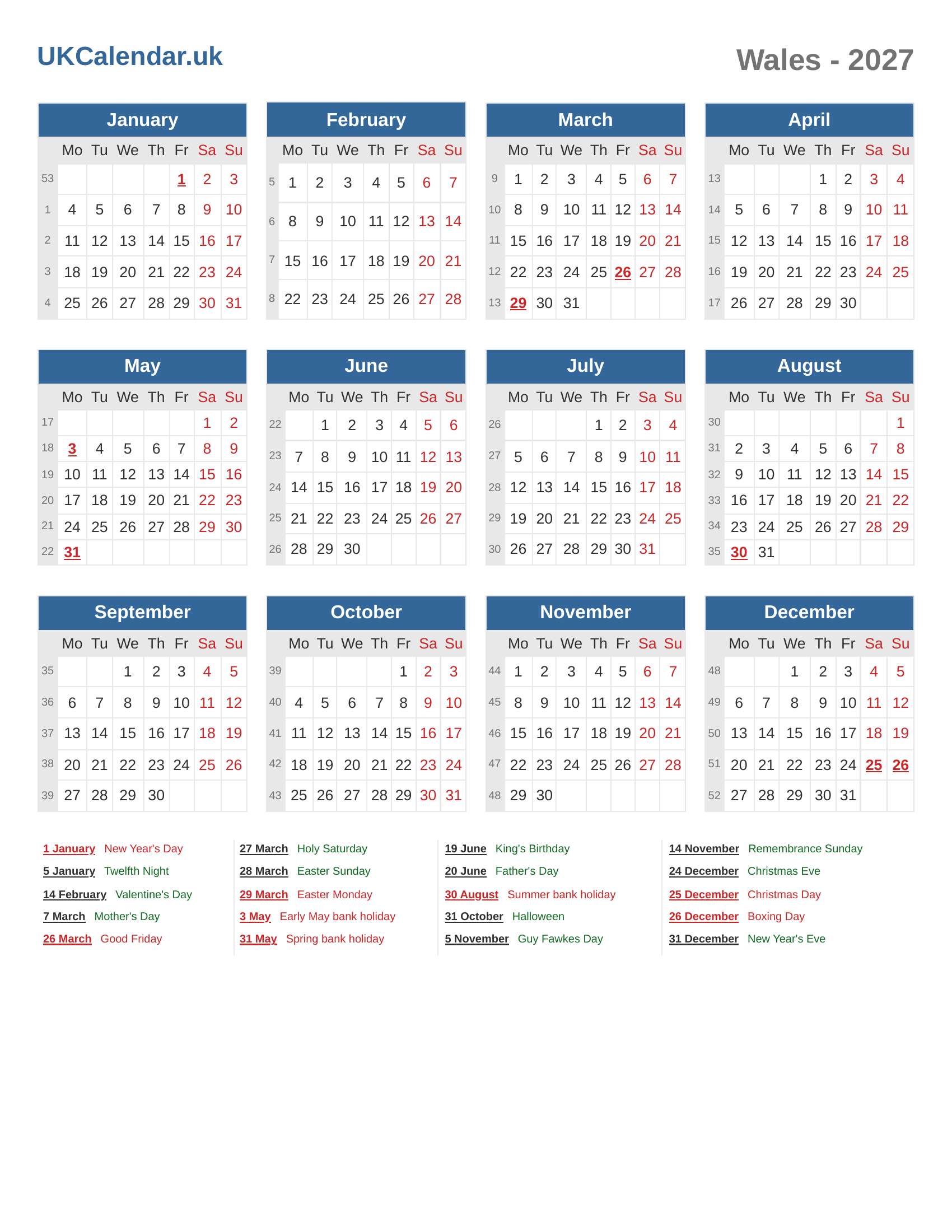 Bank Holidays and Observances in 2027 (Wales)
