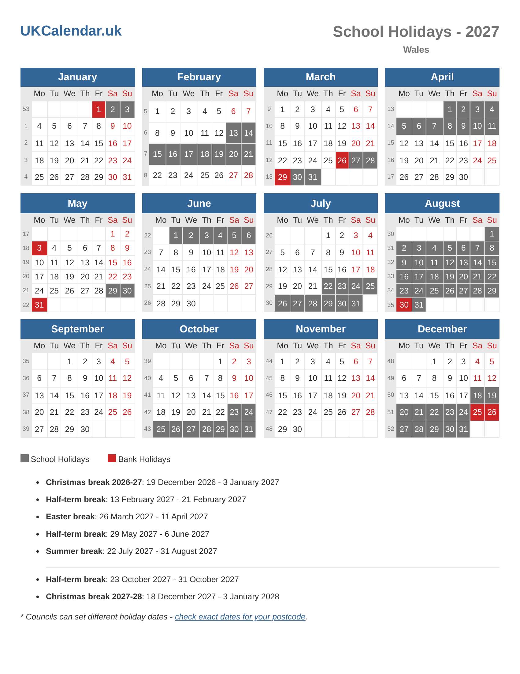 - Christmas break 2026-27: 19 December 2026 - 3 January 2027