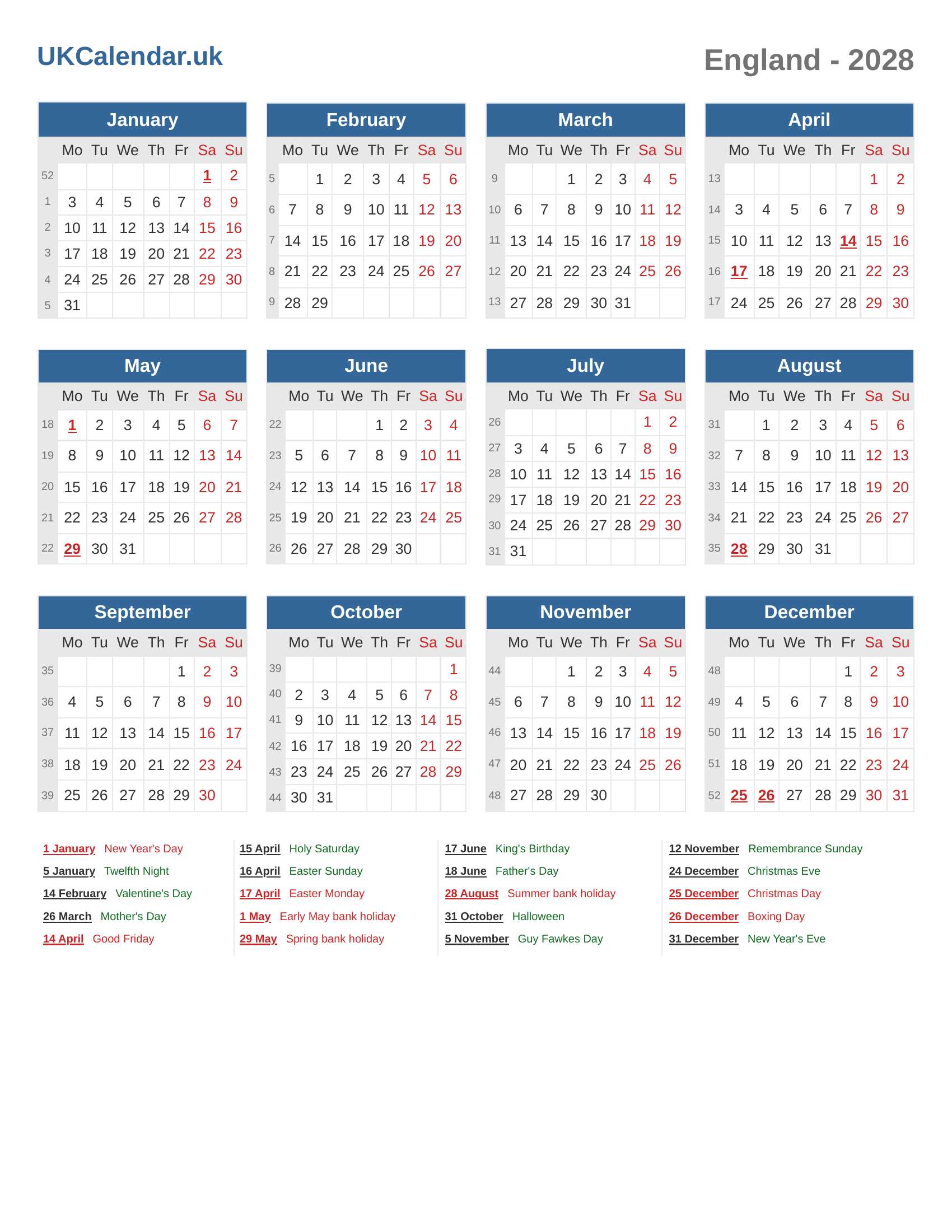 Calendar 2028 - England