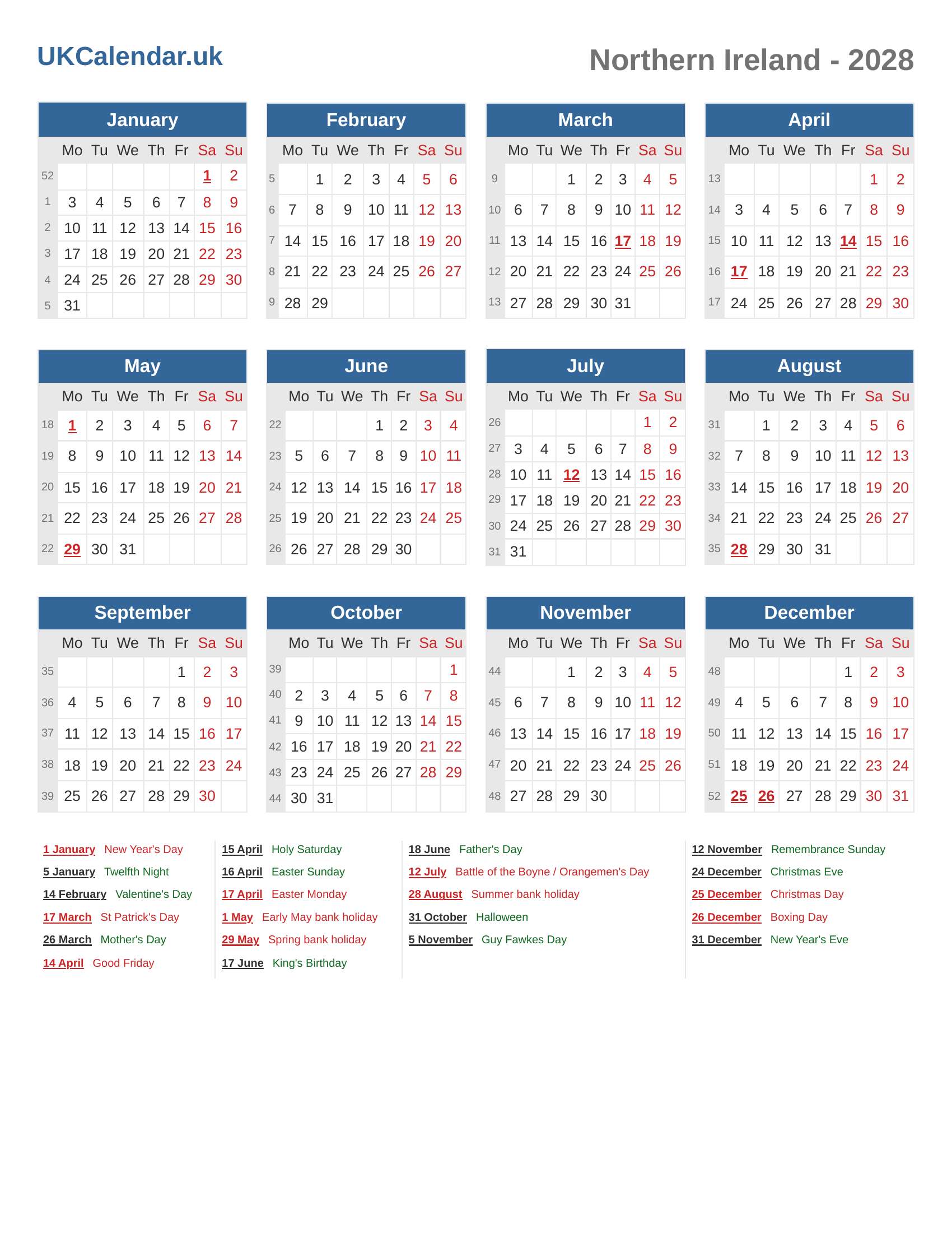 Bank Holidays and Observances in 2028 (Northern Ireland)