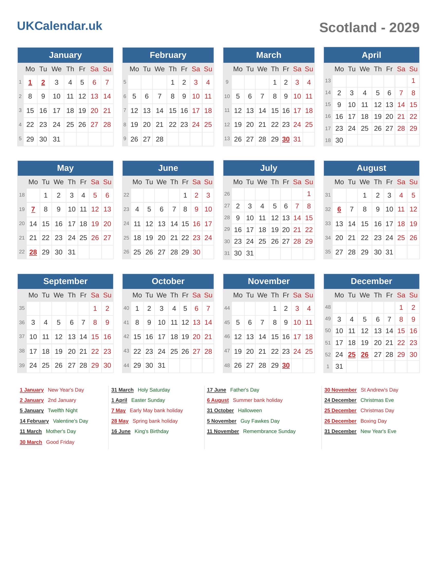 Bank Holidays and Observances in 2029 (Scotland)
