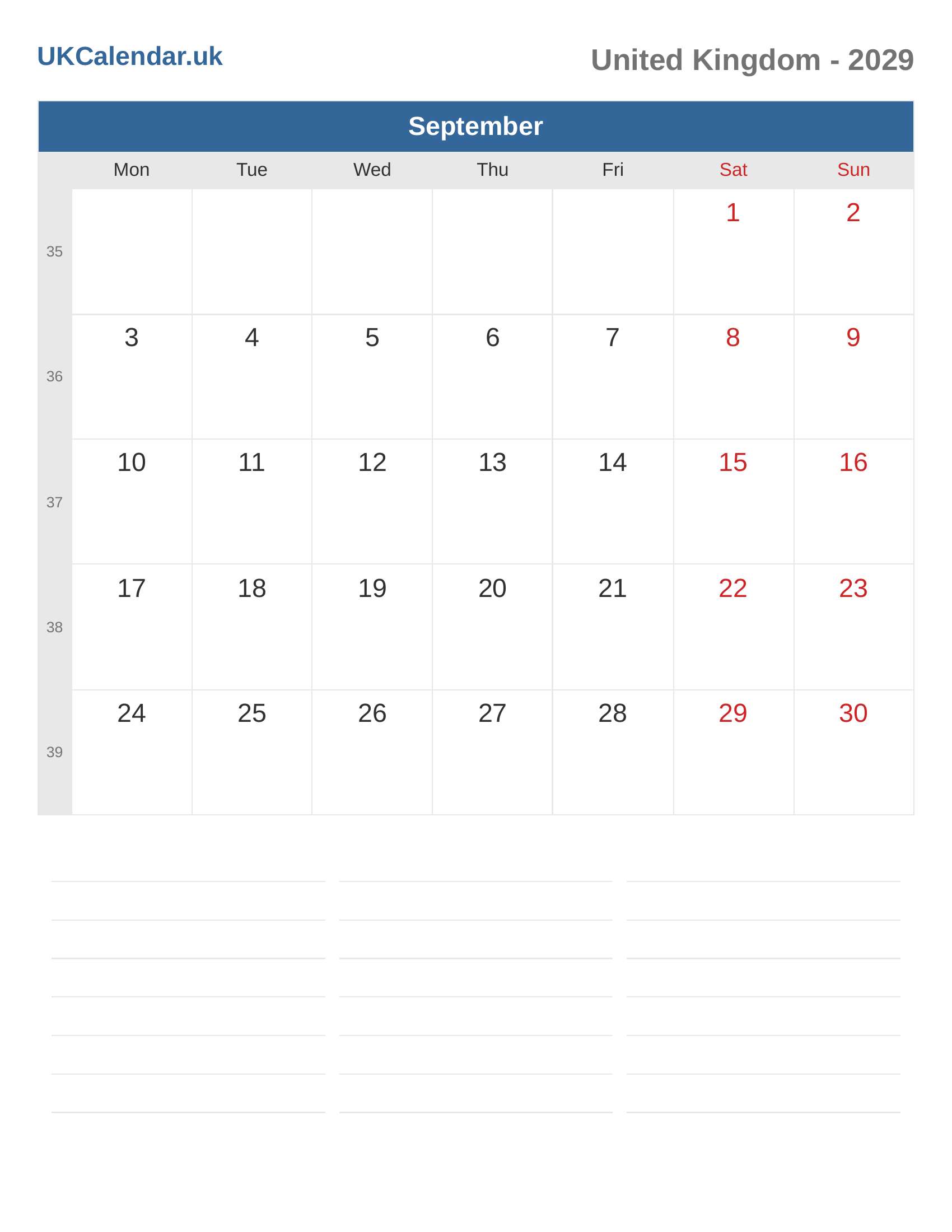 Calendar September 2029 - United Kingdom